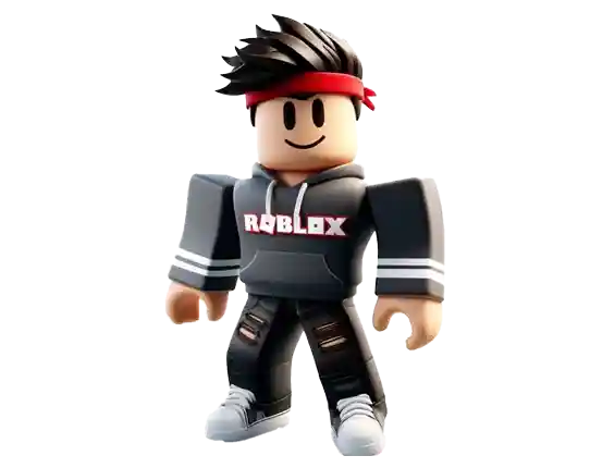 This Roblox avatar features a stylish look with a black hoodie branded with “ROBLOX” paired with ripped black jeans and trendy sneakers. The spiky black hairstyle with a red headband adds a bold touch. Perfect for casual yet cool gameplay, this character stands out with confidence and modern streetwear vibes.